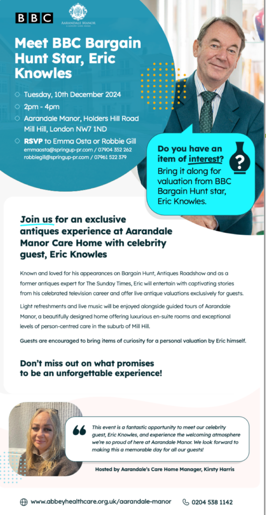For example, we helped organise for Eric Knowles of BBC Bargain Hunt fame to run an invitation-only antiques evaluation at Aarandale Manor Care Home in London, where guests could bring their own antiques to be valued.